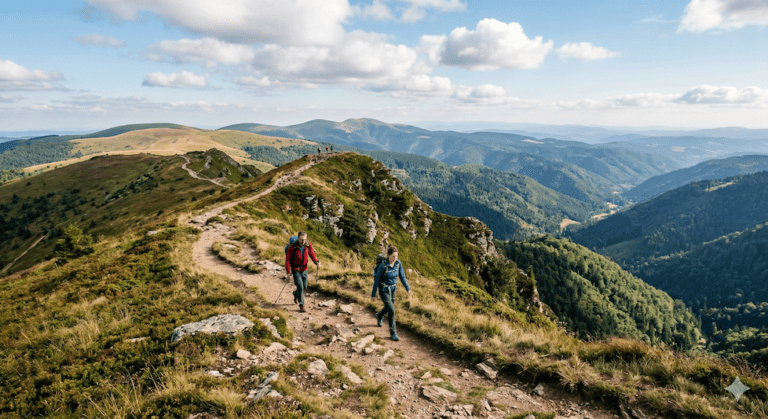 Du mythique Hohneck aux sentiers escarpés du Sentier des Roches, chaque étape de cette itinérance révèle une lumière douce et des panoramas à couper le souffle sur la plaine d’Alsace.